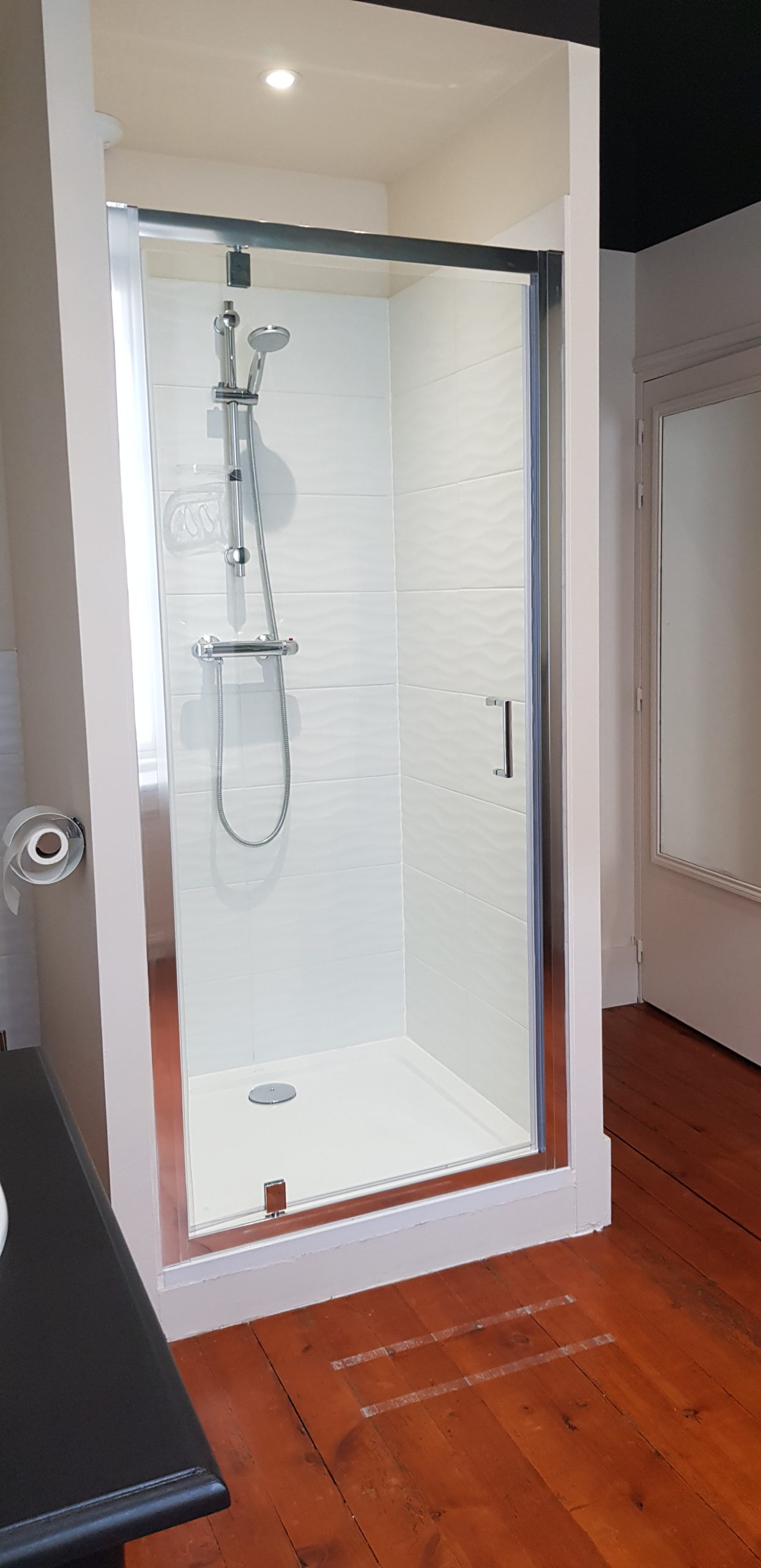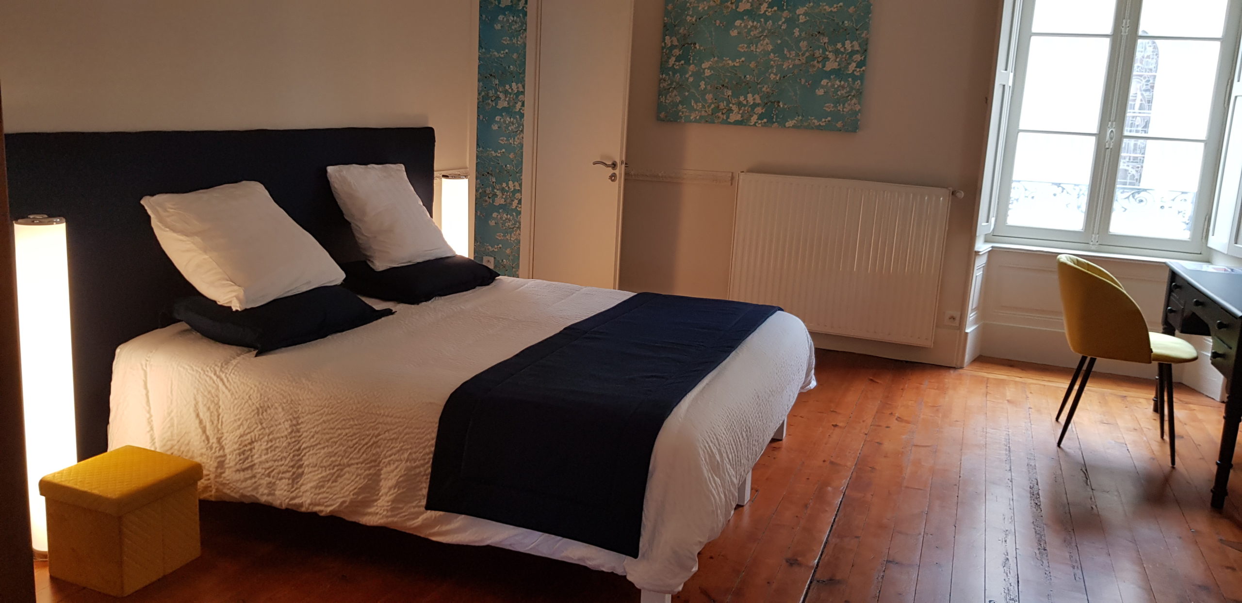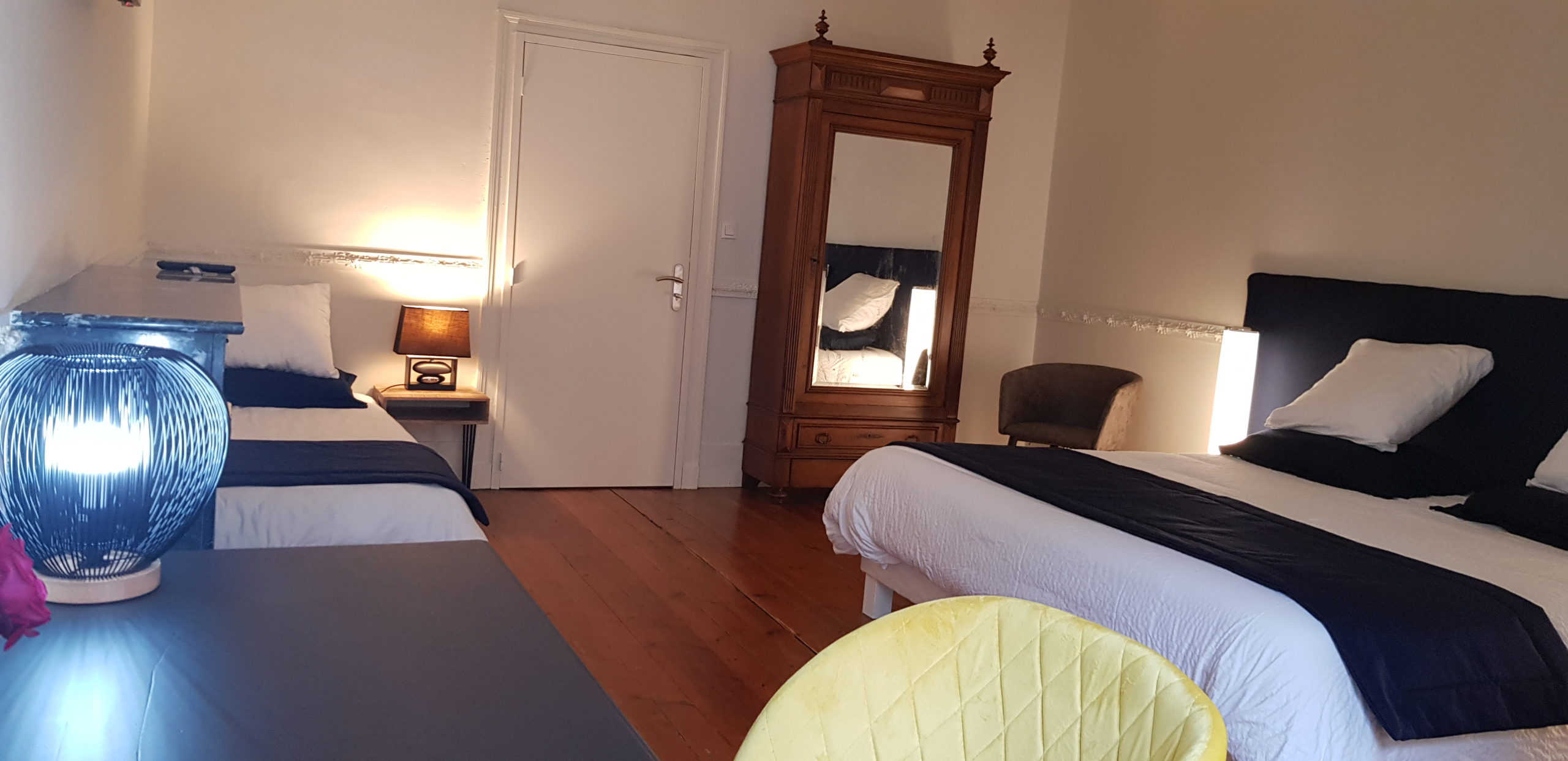 La chambre Iris, avec une belle hauteur sous plafond et 34 m² d’espace assure la possibilité d’accueillir un couple avec enfant. La chambre Iris se trouve au 1er étage. Elle est équipée d’ un lit King size (180×200) ou 2 lits (90×200),et d’un lit 90×190, d’une télévision et d’une salle d’eau. Possibilité d’installer un lit bébé à la demande.